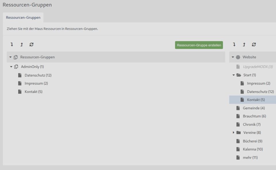 💡 Im Menü Sicherheit → Ressourcen-Gruppen bekommst du eine übersichtliche Ansicht deiner bestehenden Gruppen und kannst per Drag & Drop deine Ressourcen von der Website in AdminOnly verschieben (entfernen per Kontextmenü).