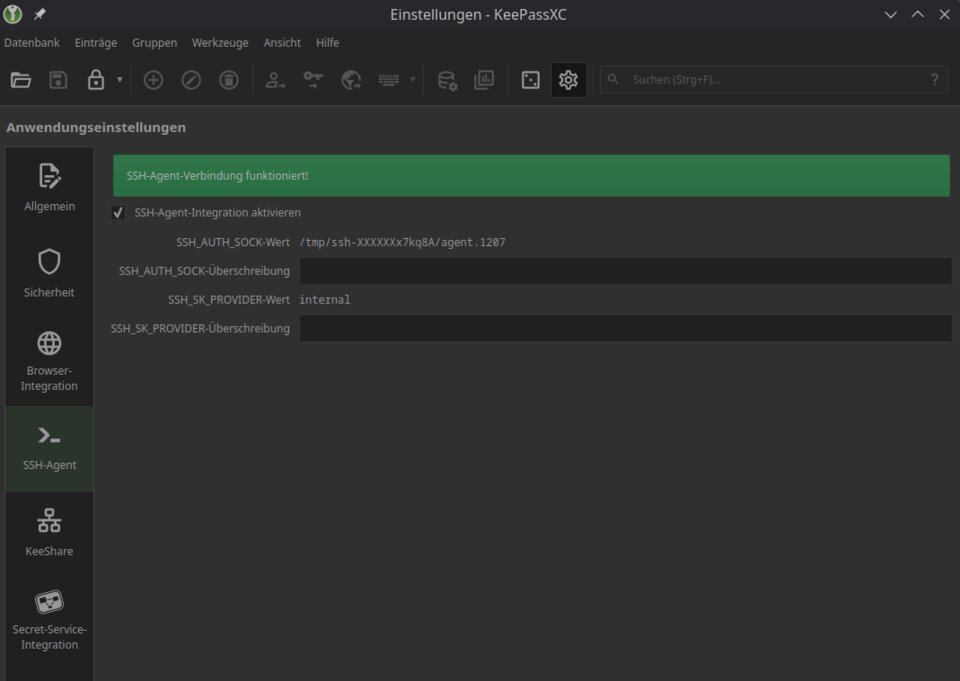 KeePassXC: Werkzeuge → Einstellungen → SSH-Agent → „SSH-Agent-Integration aktivieren“: